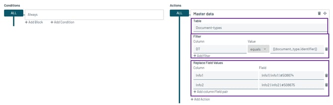 Configure the automation agent to check the document type identifier against the master data and fill in the corresponding fields. For our example, we do not need to define any conditions since the document type must be compared with the master data. We have to define the action, where we must select what table to use for the comparison, what information should be compared in the master data and what fields need to be filled.