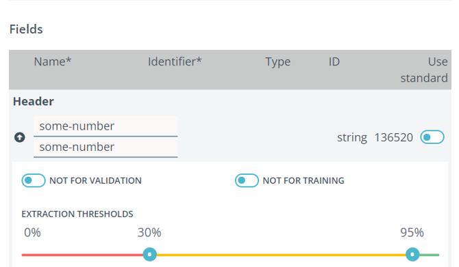 The following two threshold values of a field are relevant for the data extraction. The left limit indicates whether a candidate is entered in the field, the right limit whether the field must be offered to the user for validation.