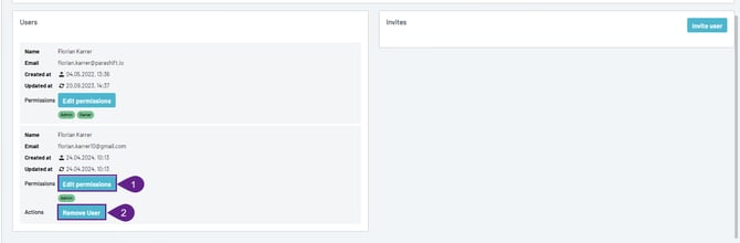 - At the bottom of the Tenant settings page, you will see all the users of the currently active tenant. From here, you can manage user roles and permissions.